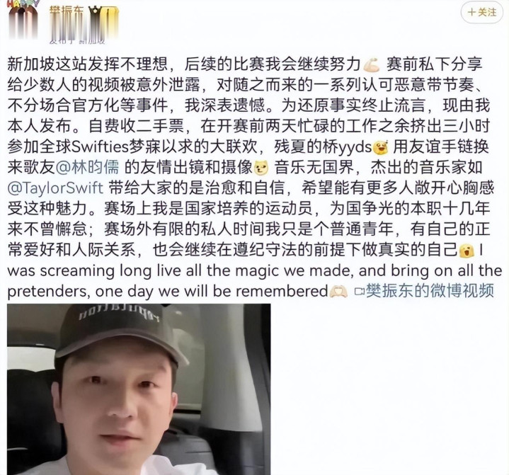 这个标签的源头可以追溯到2024年新加坡大满贯赛。樊振东在那场比赛中状态低迷,早早出局。赛后有网友在Taylor Swift的新加坡演唱会上拍到了他。照片一传出,评论区瞬间沦陷:"输了球还有心情去听演唱会?""心思根本不在训练上!"——仿佛一个运动员在输球之后,就必须回到房间面壁思过,否则就是态度有问题。