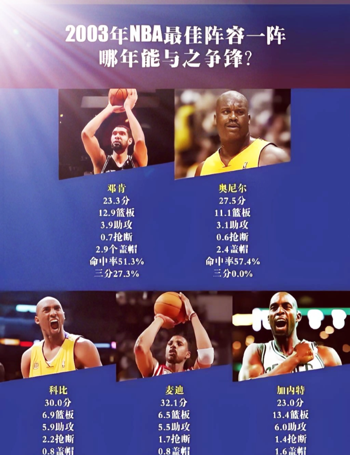 那年,科比场均能砍30分,麦迪则是拿下得分王;加内特全面得像现代内线,邓肯刚拿完MVP,奥尼尔还统治着篮下——他们五个,几乎包办了当时联盟所有的焦点。