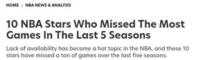恩比德“只”排名第七,或许让很多球迷意想不到,当然过去五年时间,恩比德同样缺席了多达157场比赛。而且跟很多球员比起来,他伤病程度比较严重,有出现断崖式下滑的可能性,这对于76人来说,堪称是晴天霹雳。此外英格拉姆、克莱-汤普森和欧文,同样出现在这个榜单,尤其英格拉姆跟欧文,上赛季都提前报销了。