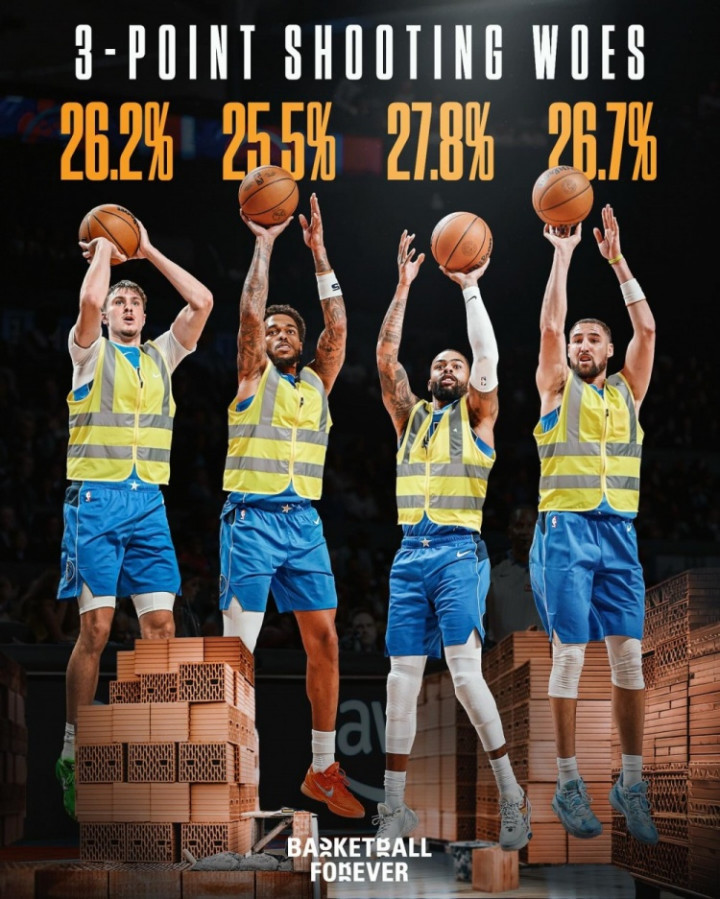 直播吧11月12日讯独行侠本赛季的三分状态相当糟糕。全队除了克里斯蒂(45.3%)以及哈迪(36%)之外,其他球员的三分命中率都低于30%。要知道球队有包括克莱、拉塞尔在内多位外线准度不错的球员。